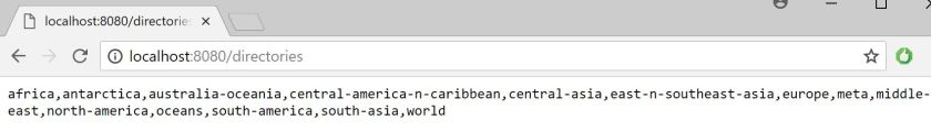 Now when visiting localhost:8080 we will see “Welcome to the CIA World Factbook. Check for directories with /directories” printed out. I have hidden some complexity behind the helper function createStringResponse.