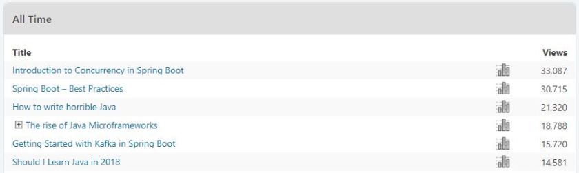 - Getting Started with Kafka in Spring Boot – I am a bit surprised that this one is so popular! I guess Kafka is difficult and popular!