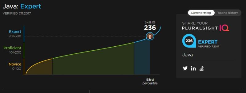 Another great thing that they offer is the “Skill IQ”. These are online tests that you can take to get a reality check of how good you are with different tech. You can see my Java level here.
