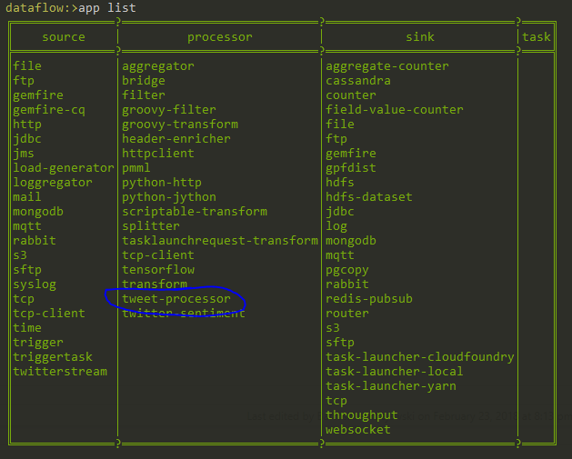 This will register the app under the name tweet-processor. You should see the message: “Successfully registered application ‘processor:tweet-processor’”, but lets just be double sure here and play a bit more with the Shell itself. Type into the shell: