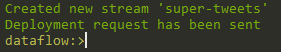 stream create super-tweets --definition "twitterstream --access-token-secret=SECRET --access-token=SECRET --consumer-secret=SECRET --consumer-key=SECRET --stream-type=sample | tweet-processor | file --directory=c:\scdf" --deploy "true"
