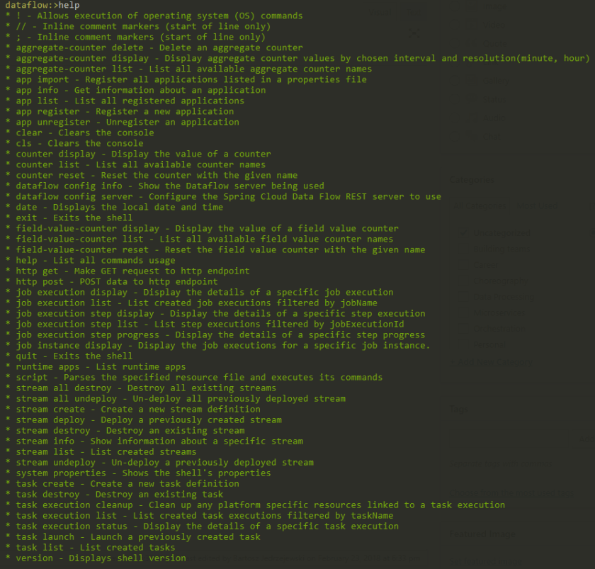 What you have read here is quite simple, but very important. Defining custom Apps lays at the core of what Spring Cloud Data Flow can be used for. Using Shell for working with the platform can be incredibly useful. With this knowledge you will be able to start doing some very powerful things with Data Flow. In the future articles I will look at more complex Streams and the built Analytics that you get with the Spring Cloud Data Flow.