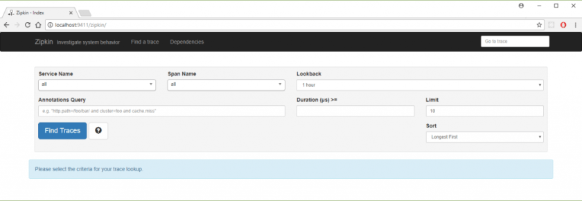 It runs by default on the port 9411, but this can be changed by passing different environment variables. If you are not keen on docker, you can run Zipkin Server in multiple different ways as listed by their official Quickstart. After starting Zipkin server and visiting port 9411 on your localhost you should see something like that: