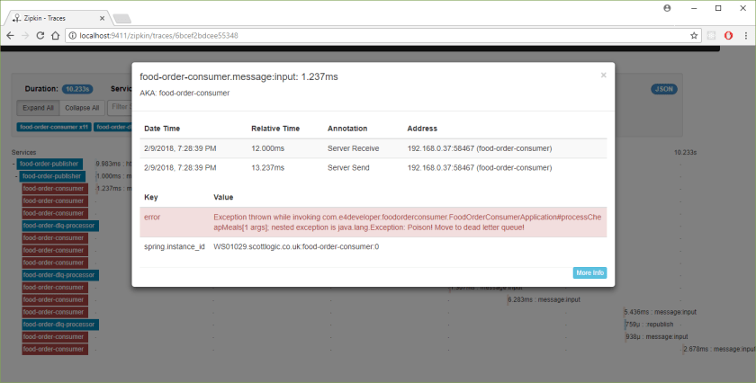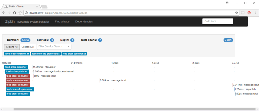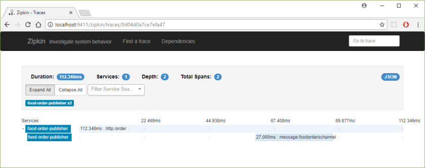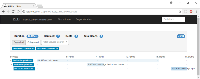 2018-02-08 22:30:16.457 DEBUG [food-order-publisher,888114b702f9c3aa,888114b702f9c3aa,true] 12572 --- [nio-8080-exec-7] o.s.c.s.i.web.TraceHandlerInterceptor : Adding a method tag with value [orderFood] to a span [Trace: 888114b702f9c3aa, Span: 888114b702f9c3aa, Parent: null, exportable:true]